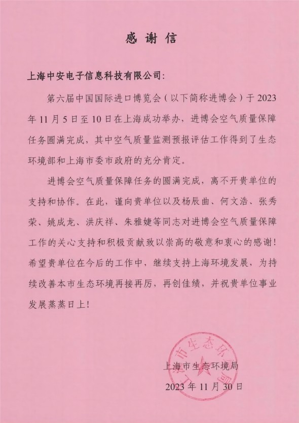 上海環(huán)監(jiān)中心就中安科技在21年國際進博會空氣質量監(jiān)測預報工作中杰出貢獻送來感謝信!(2021/12/31)
